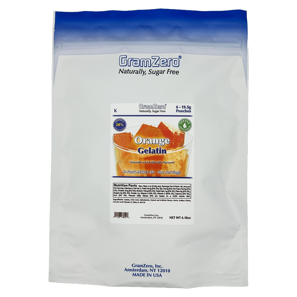 GramZero Sugar Free Gelatin Mixes are low carb gelatin mixes that are sweetened with Stevia and fortified with 20% RDA Vitamin C. GramZero Sugar Free Gelatin Mixes taste like sugar sweetened gelatins with no aftertaste, yet register zero grams of sugar, zero calories and zero sugar alcohols.