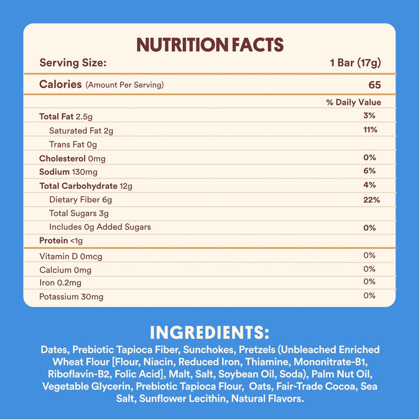 Each 3 oz bar delivers 13 grams of prebiotic fiber, 150 calories, and absolutely no added sugar, making them a smart choice for satisfying self-care, sweet cravings, or a treat in your bag. Made with ingredients like date caramel, pretzel or nuts (depending on variety), oat-milk chocolate, and other whole food or plant-based components, they bring guilt-free richness without artificial add-ons.