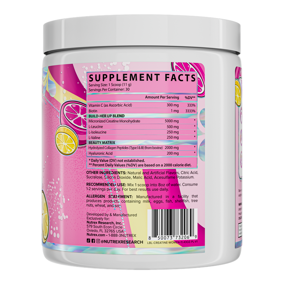Take your fitness and beauty goals to the next level with Nutrex Creatine For Women + Booty & Beauty — a blend crafted specifically with the needs of active women in mind. This hybrid formula delivers 5g micronized creatine monohydrate per serving plus beauty-boosting ingredients like collagen, biotin, hyaluronic acid, BCAAs, and vitamin C to support lean muscle, recovery, and glowing skin — all without the bloat.