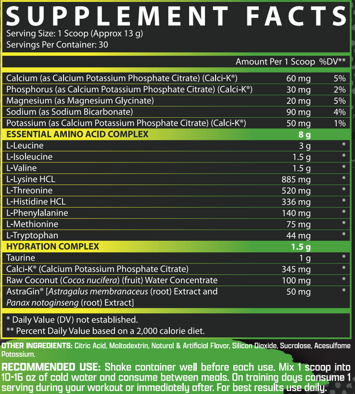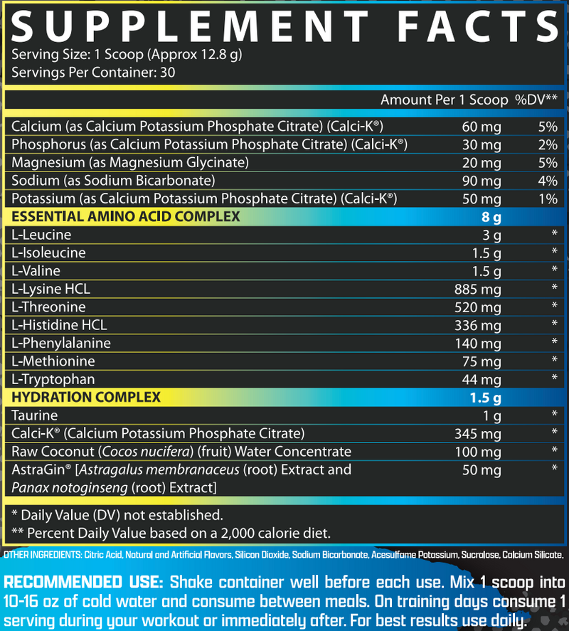 Mix 1 scoop with 10–14 oz of cold water and sip during workouts, throughout the day, or whenever you need hydration and recovery support.