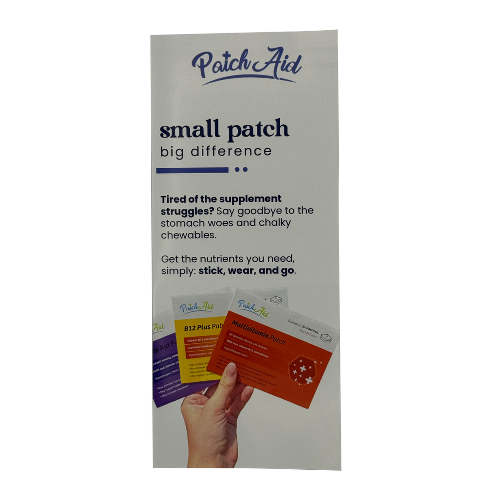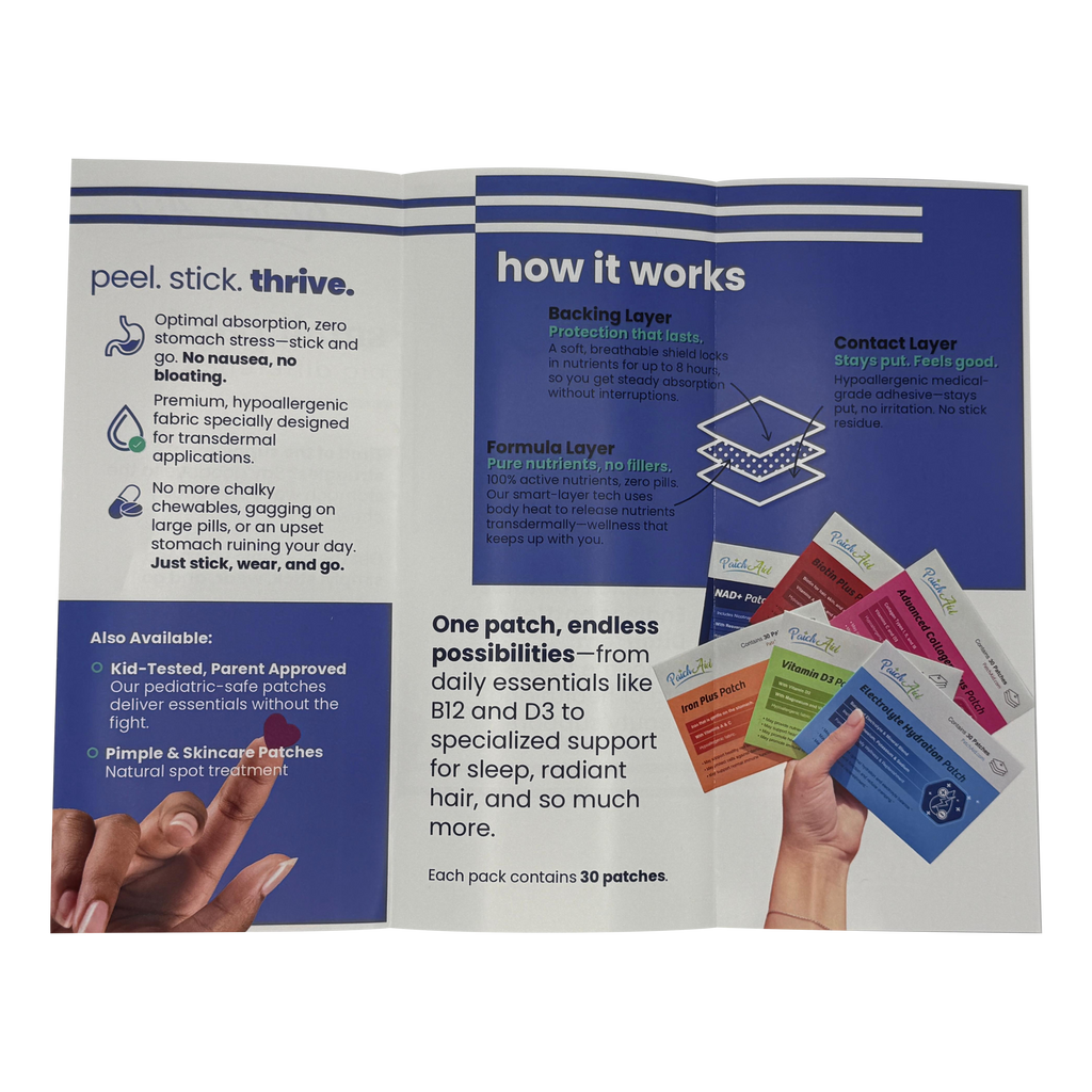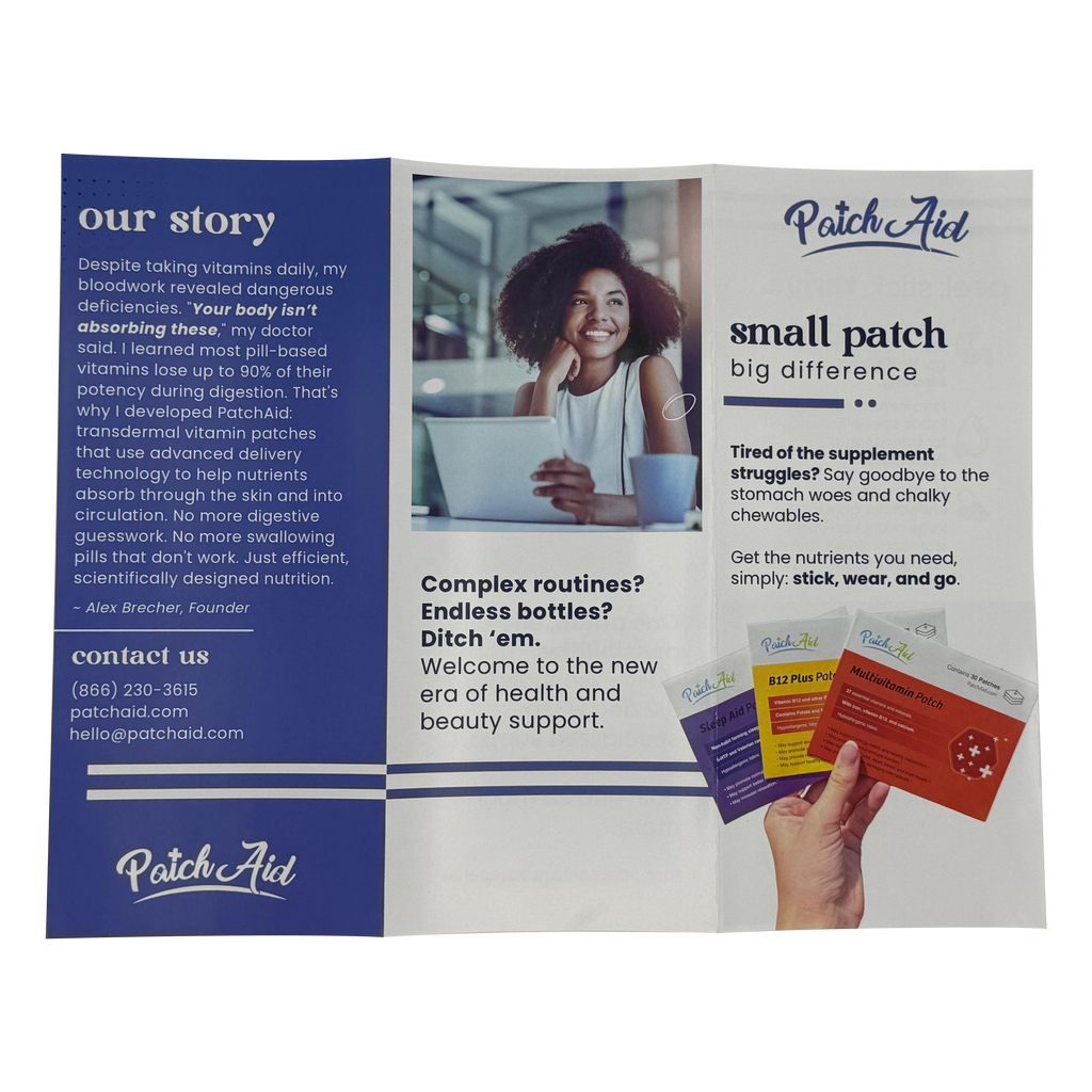 Make it easy for your customers to understand the PatchAid difference. These professionally printed trifolds highlight the benefits of PatchAid vitamin patches and pimple patches, including how they work and why customers love them.