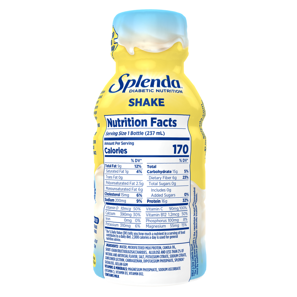 Splenda Diabetes Care Shake RTD is a smooth and creamy, ready-to-drink meal or snack replacement shake. Splenda Diabetes Care Shakes contain high-quality protein, slow-digesting carbohydrates, good fats, and key vitamins and minerals to help manage blood sugar and help reduce blood sugar spikes. Splenda Diabetes Care Shakes are sweetened with zero-calorie Splenda Sucralose.