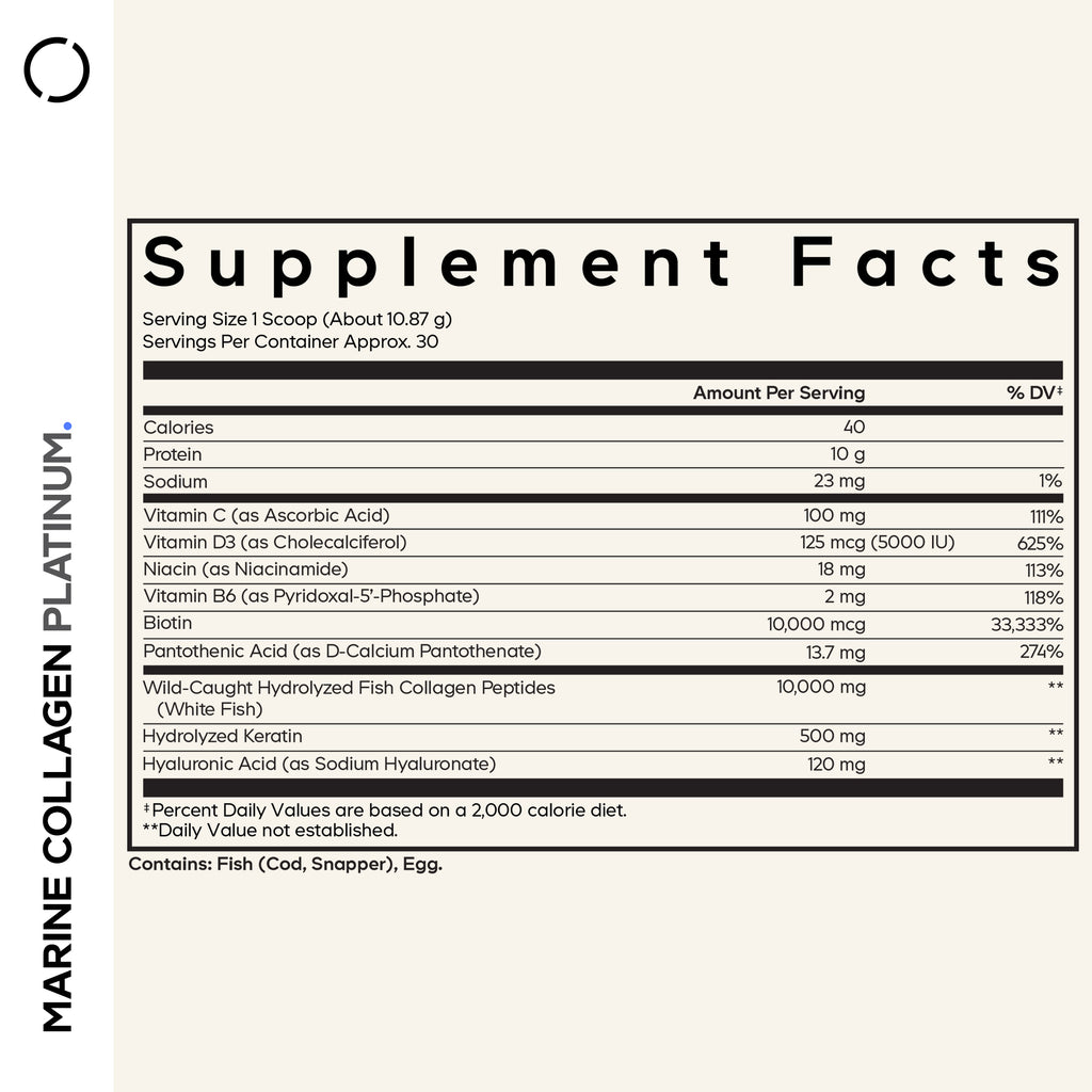 Codeage Wild Caught Marine Collagen Peptides Powder Platinum is a high-quality collagen supplement made from wild-caught marine collagen from North American cold waters. It contains a high level of hydrolyzed fish collagen powder types 1 and 3, 10,000 mcg biotin, vitamin C, vitamin D3, vitamin B6, niacin, pantothenic acid, and hydrolyzed keratin.