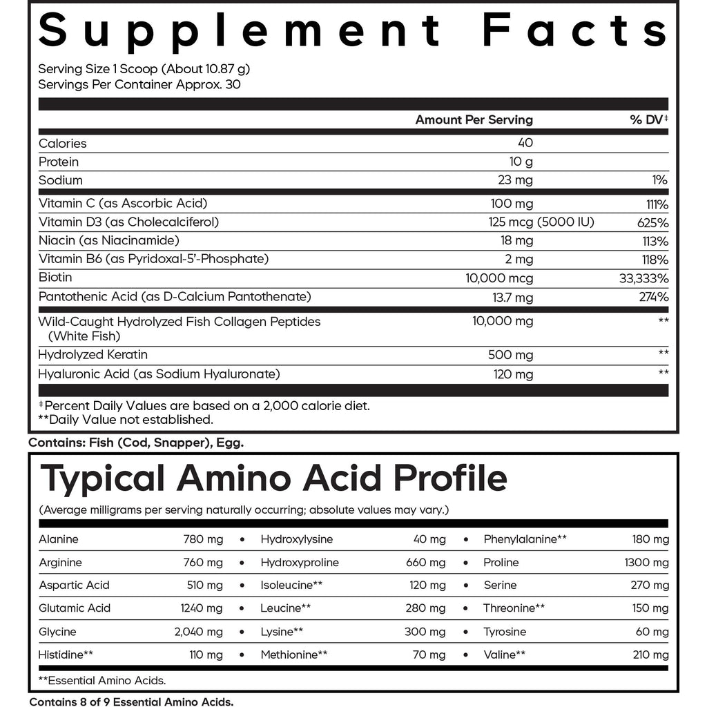 - Features a high level of fish collagen types 1 and 3, biotin 10000 mcg, vitamin C, vitamin D3, vitamin B6, niacin, pantothenic acid, and hydrolyzed keratin all-in-one.